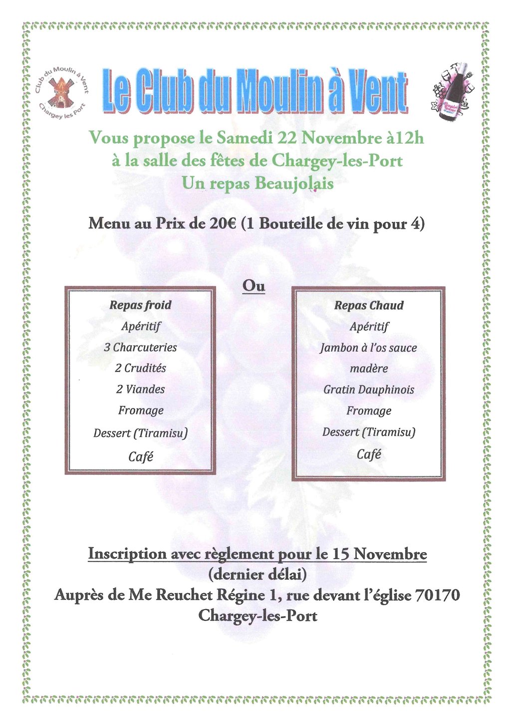 Repas Beaujolais organisé par le club du Moulin à Vent.